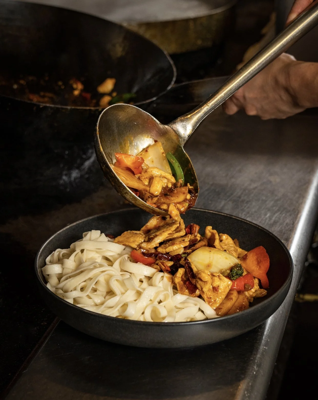 Wide Flour Noodles, Garlic, Black Bean Paste, Potato, Peppers